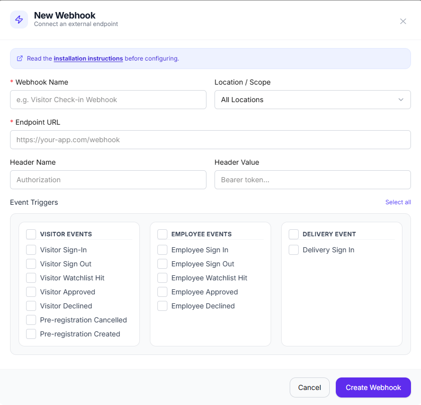 Once configured, Visitly will send a POST request with visitor data to the specified URL whenever a visitor signs in or signs out at the selected location.
