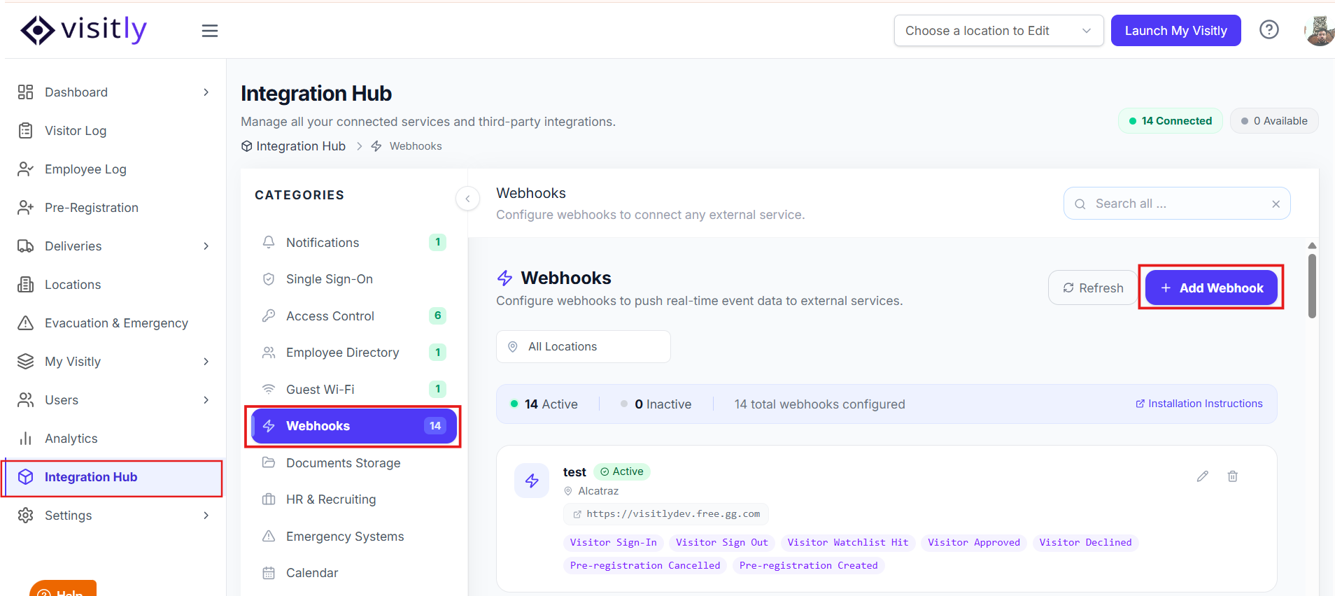 2. Navigate to Integrations Hub > Webhooks from the left-hand menu.